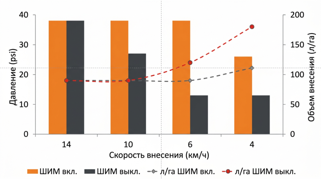 Сохранение давления и заданного размера капли в диапазоне скоростей от 4 до 30 км/ч
